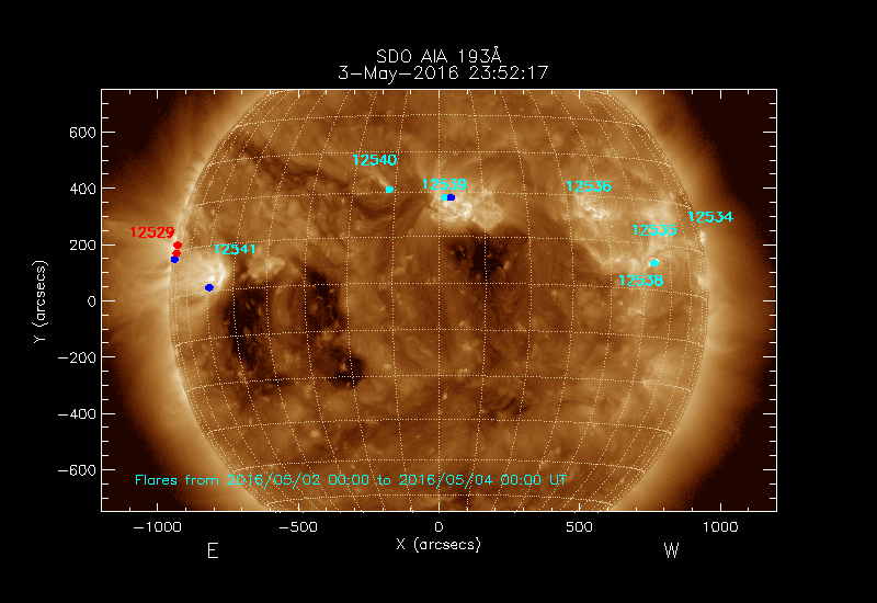 The most recent flares (≤12 hours) are shown as red dots, 12-24 hours ago as blue dots and older ones as turquoise dots.