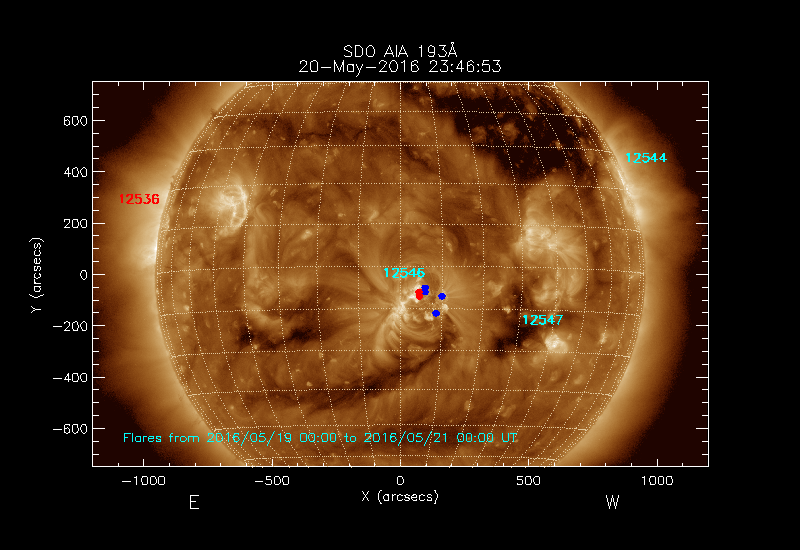The most recent flares (≤12 hours) are shown as red dots, 12-24 hours ago as blue dots and older ones as turquoise dots.
