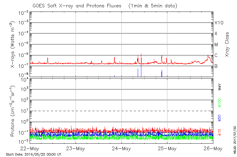 This page provides light-curves generated from GOES soft X-ray and Particle data for the date indicated at the top and the preceding three days.