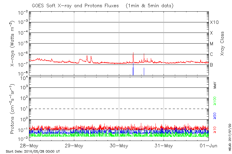 This page provides light-curves generated from GOES soft X-ray and Particle data for the date indicated at the top and the preceding three days.