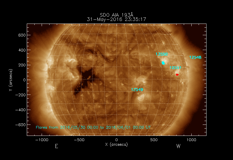Click on an Active Region plot to display the Region Report including the region evolution and flaring history. HEC Search for NOAA Active Regions (SRS) records for this date and the day before.