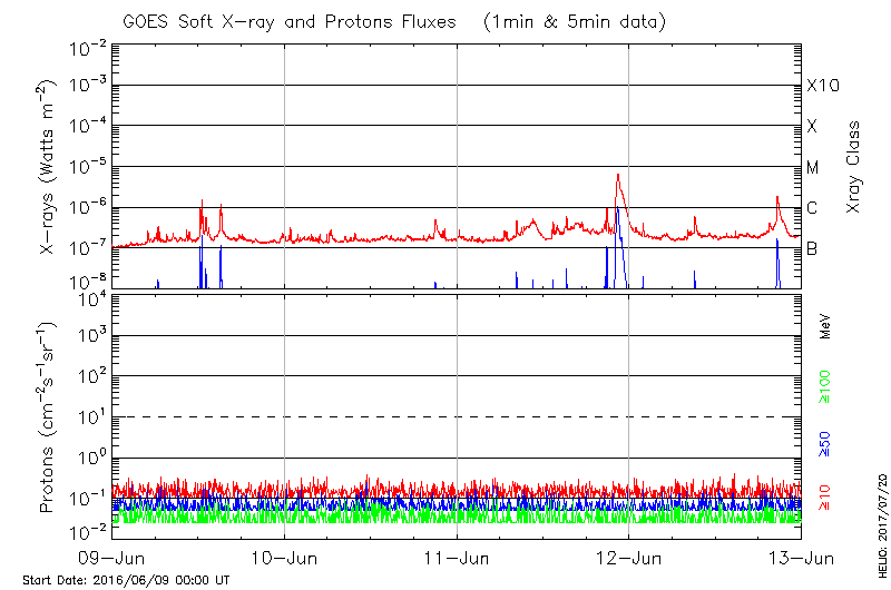 This page provides light-curves generated from GOES soft X-ray and Particle data for the date indicated at the top and the preceding three days.