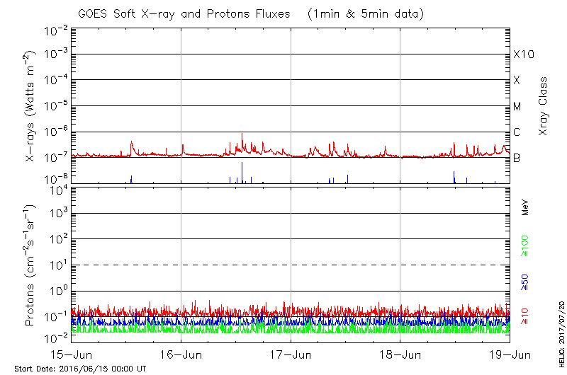 This page provides light-curves generated from GOES soft X-ray and Particle data for the date indicated at the top and the preceding three days.