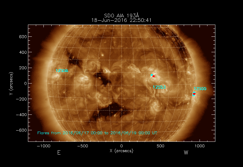 Click on an Active Region plot to display the Region Report including the region evolution and flaring history. HEC Search for NOAA Active Regions (SRS) records for this date and the day before.