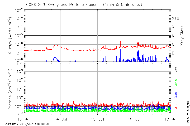 This page provides light-curves generated from GOES soft X-ray and Particle data for the date indicated at the top and the preceding three days.