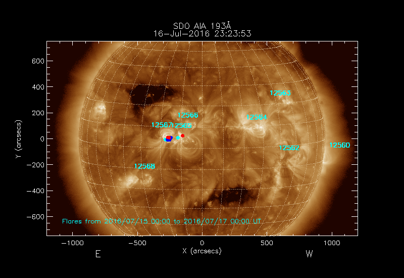 The most recent flares (≤12 hours) are shown as red dots, 12-24 hours as blue