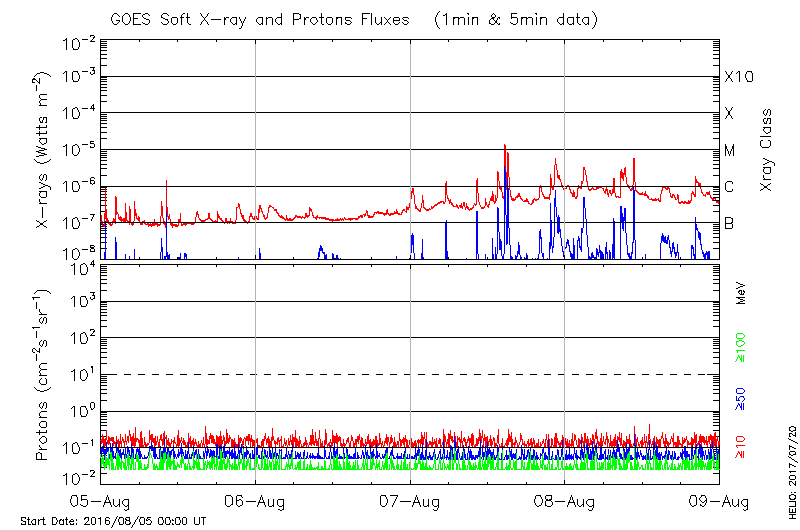 This page provides light-curves generated from GOES soft X-ray and Particle data for the date indicated at the top and the preceding three days.