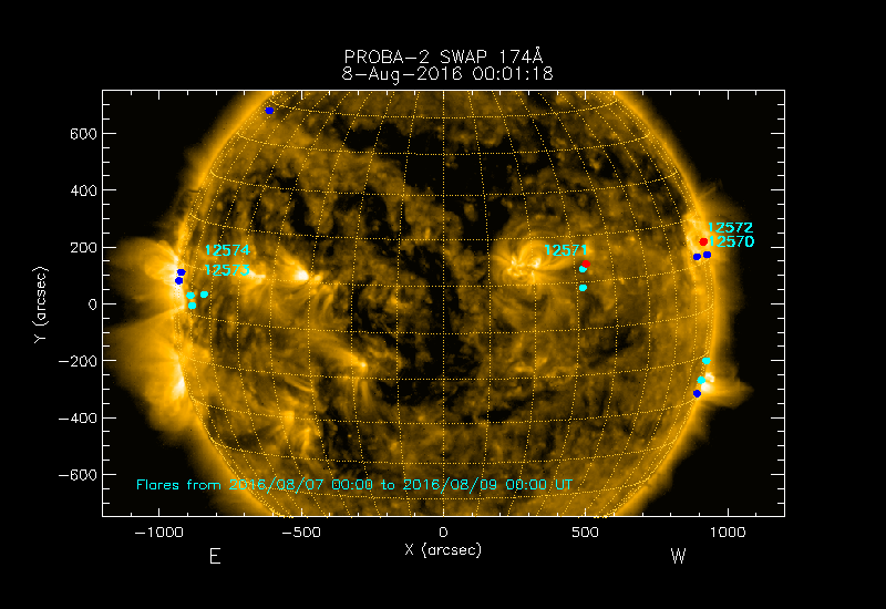 The most recent flares (≤12 hours) are shown as red dots, 12-24 hours ago as blue dots and older ones as turquoise dots.