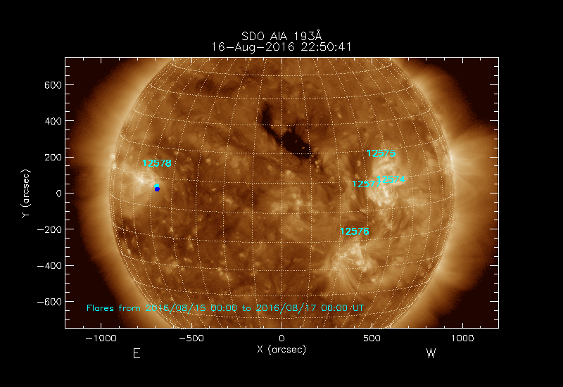 Click on an Active Region plot to display the Region Report including the region evolution and flaring history. HEC Search for NOAA Active Regions (SRS) records for this date and the day before.