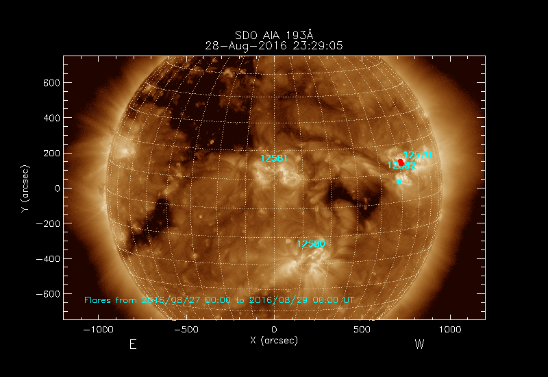 The most recent flares (≤12 hours) are shown as red dots, 12-24 hours ago as blue dots and older ones as turquoise dots.
