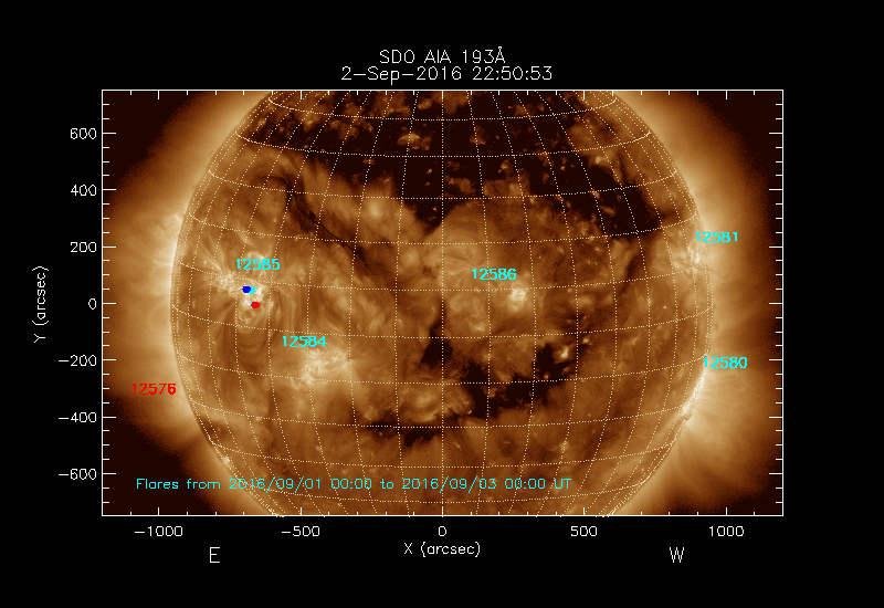 The most recent flares (≤12 hours) are shown as red dots, 12-24 hours ago as blue dots and older ones as turquoise dots.