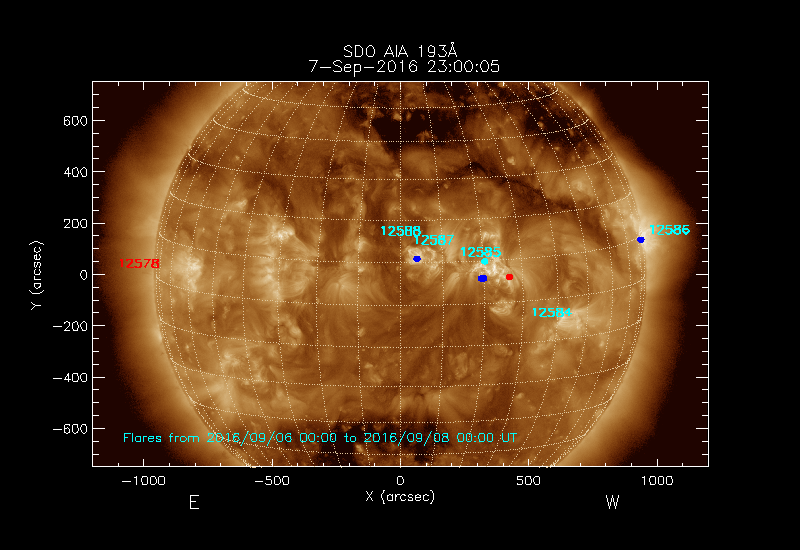 The most recent flares (≤12 hours) are shown as red dots, 12-24 hours ago as blue dots and older ones as turquoise dots.