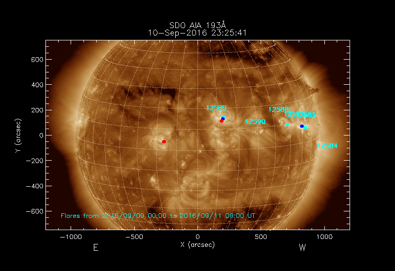 The most recent flares (≤12 hours) are shown as red dots, 12-24 hours ago as blue dots and older ones as turquoise dots.