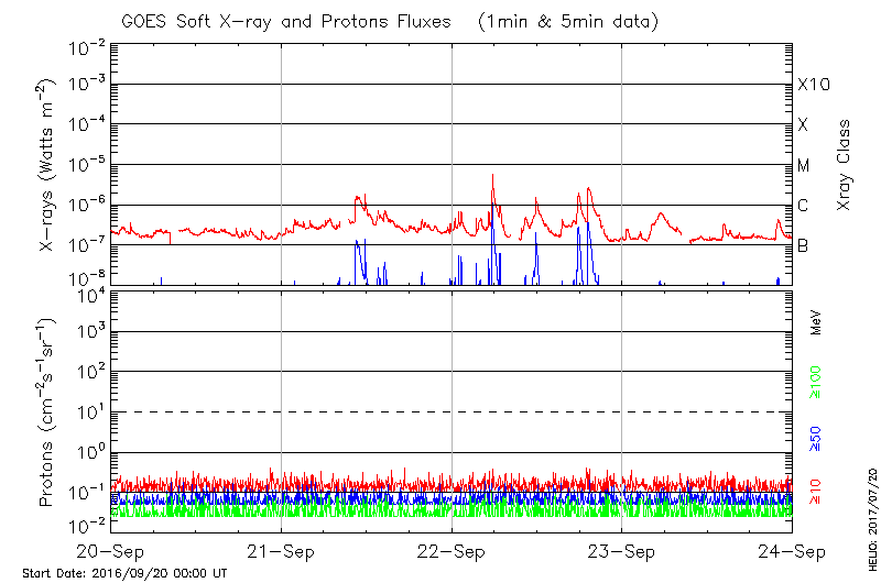 This page provides light-curves generated from GOES soft X-ray and Particle data for the date indicated at the top and the preceding three days.