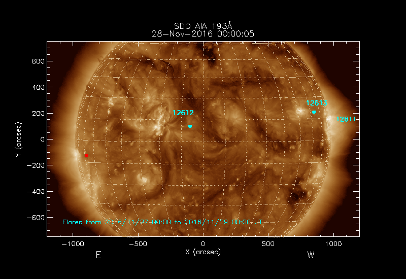Click on an Active Region plot to display the Region Report including the region evolution and flaring history. HEC Search for NOAA Active Regions (SRS) records for this date and the day before.