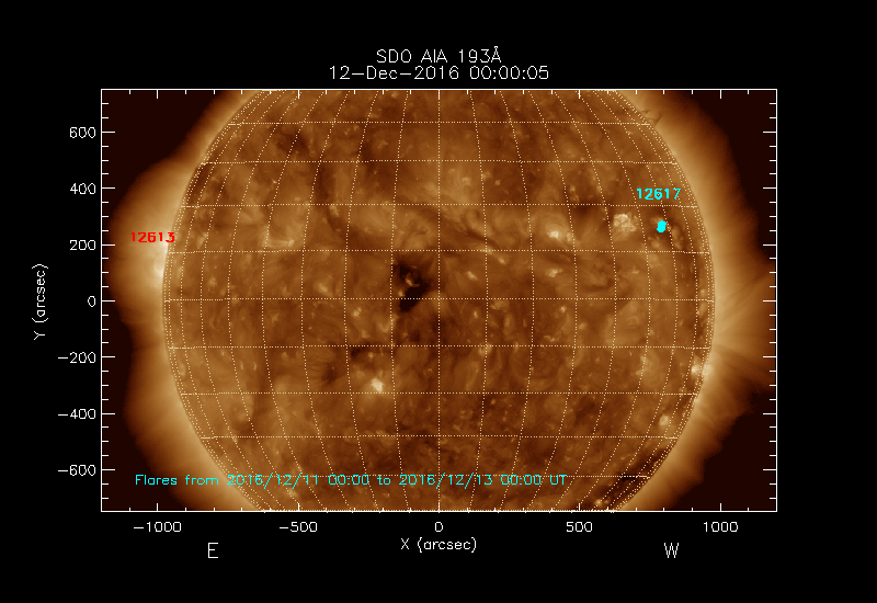 All soft X-ray flares (≥A1.0) where the location has been determined are shown; the flare locations are rotated to the time of the image