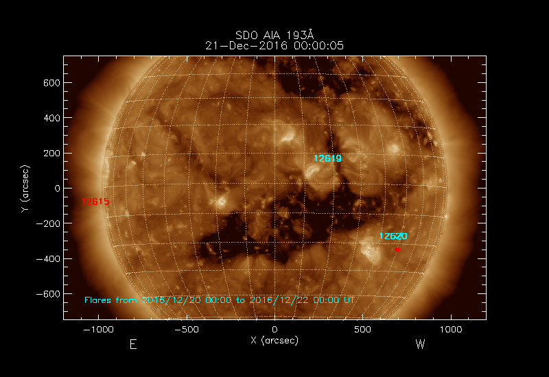 Click on an Active Region plot to display the Region Report including the region evolution and flaring history. HEC Search for NOAA Active Regions (SRS) records for this date and the day before.