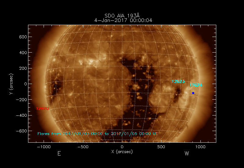 All soft X-ray flares (≥A1.0) where the location has been determined are shown; the flare locations are rotated to the time of the image