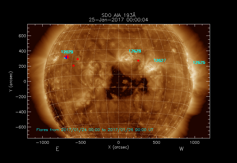 The most recent flares (≤12 hours) are shown as red dots, 12-24 hours ago as blue dots and older ones as turquoise dots.