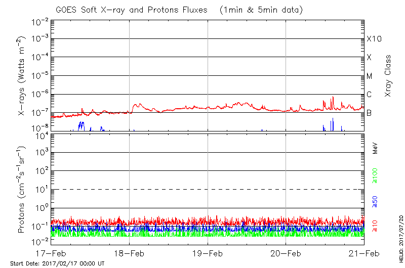 This page provides light-curves generated from GOES soft X-ray and Particle data for the date indicated at the top and the preceding three days.