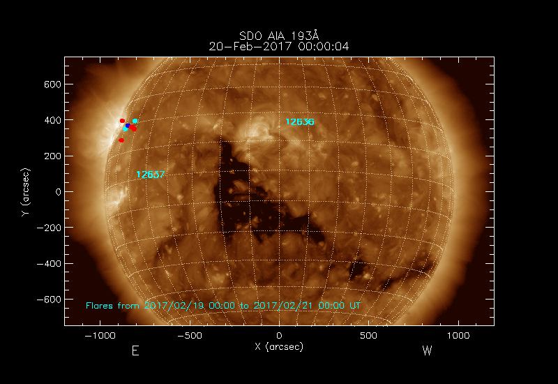 The most recent flares (≤12 hours) are shown as red dots, 12-24 hours ago as blue dots and older ones as turquoise dots.