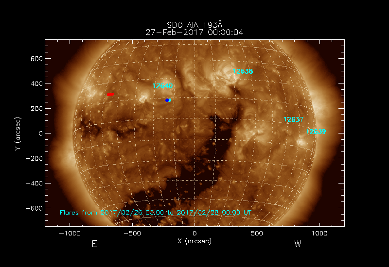 The most recent flares (≤12 hours) are shown as red dots, 12-24 hours as blue