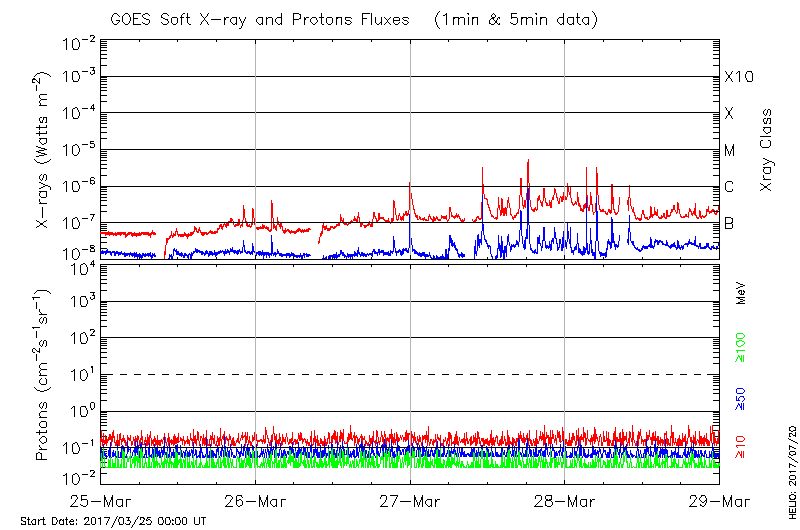 This page provides light-curves generated from GOES soft X-ray and Particle data for the date indicated at the top and the preceding three days.