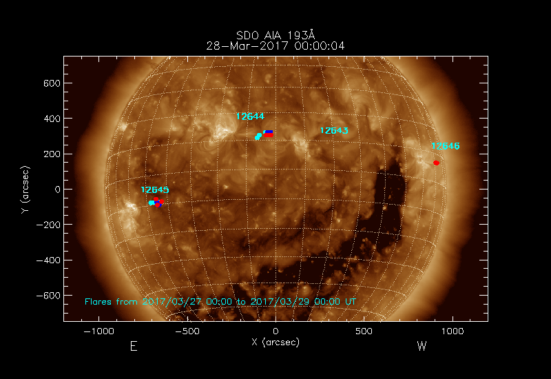 The most recent flares (≤12 hours) are shown as red dots, 12-24 hours ago as blue dots and older ones as turquoise dots.