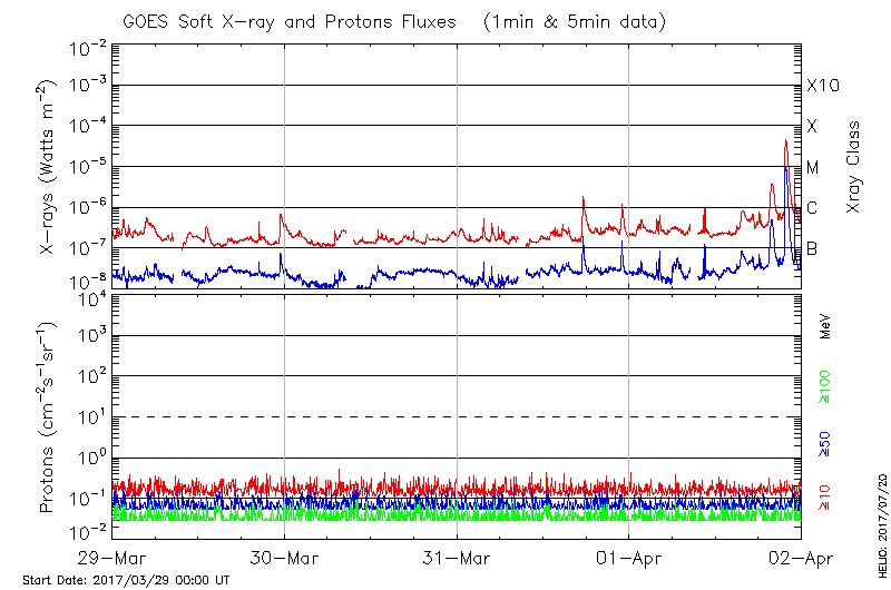 This page provides light-curves generated from GOES soft X-ray and Particle data for the date indicated at the top and the preceding three days.