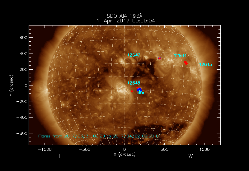 The most recent flares (≤12 hours) are shown as red dots, 12-24 hours ago as blue dots and older ones as turquoise dots.