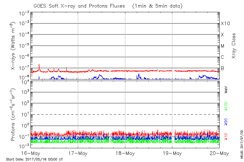 This page provides light-curves generated from GOES soft X-ray and Particle data for the date indicated at the top and the preceding three days.
