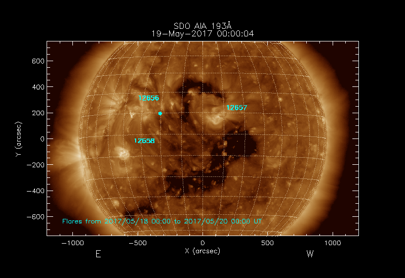 Click on an Active Region plot to display the Region Report including the region evolution and flaring history. HEC Search for NOAA Active Regions (SRS) records for this date and the day before.