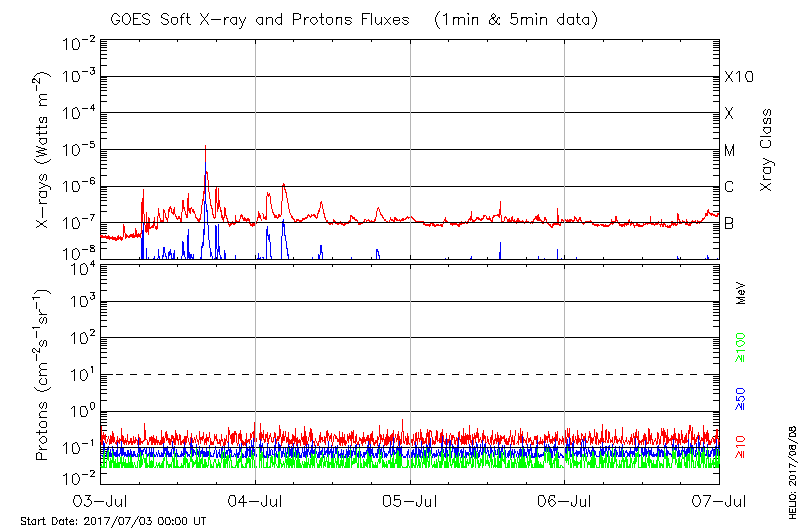 This page provides light-curves generated from GOES soft X-ray and Particle data for the date indicated at the top and the preceding three days.