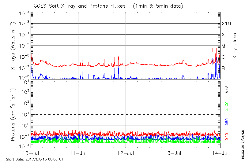 This page provides light-curves generated from GOES soft X-ray and Particle data for the date indicated at the top and the preceding three days.