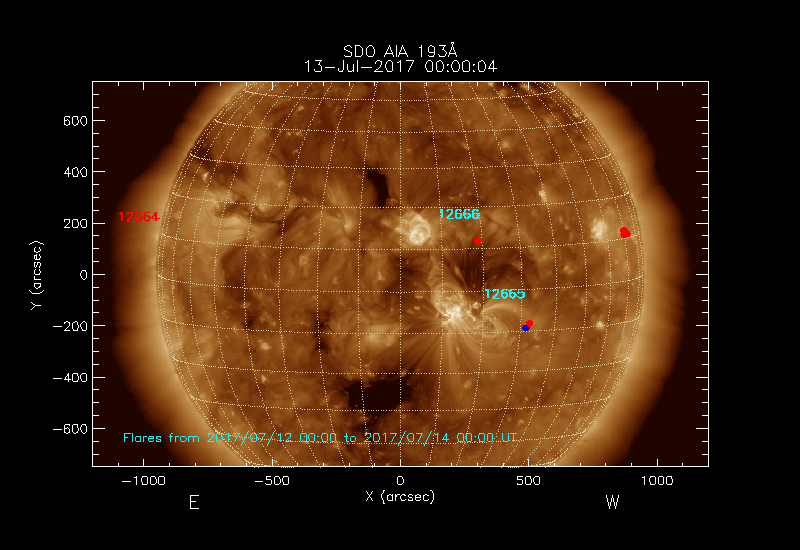 The most recent flares (≤12 hours) are shown as red dots, 12-24 hours ago as blue dots and older ones as turquoise dots.