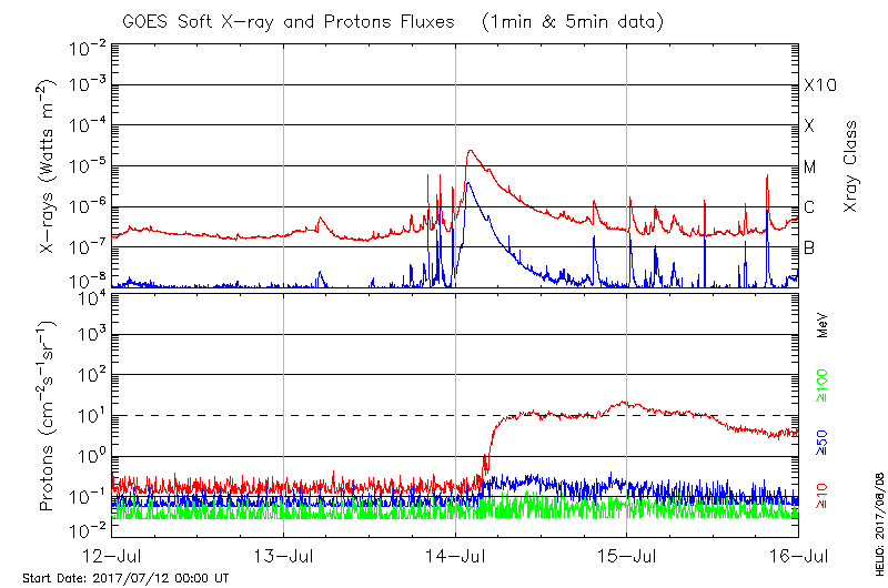 This page provides light-curves generated from GOES soft X-ray and Particle data for the date indicated at the top and the preceding three days.