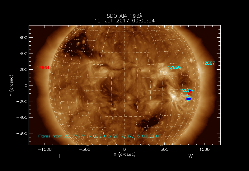 The most recent flares (≤12 hours) are shown as red dots, 12-24 hours ago as blue dots and older ones as turquoise dots.