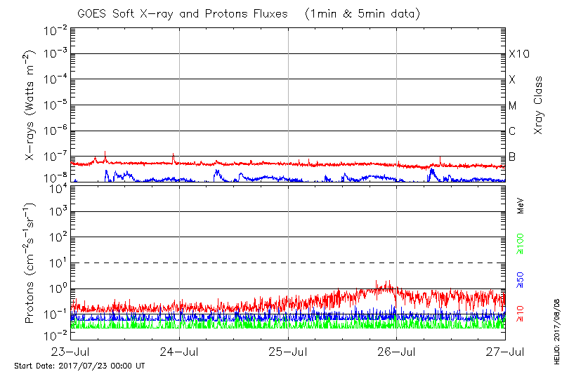 This page provides light-curves generated from GOES soft X-ray and Particle data for the date indicated at the top and the preceding three days.