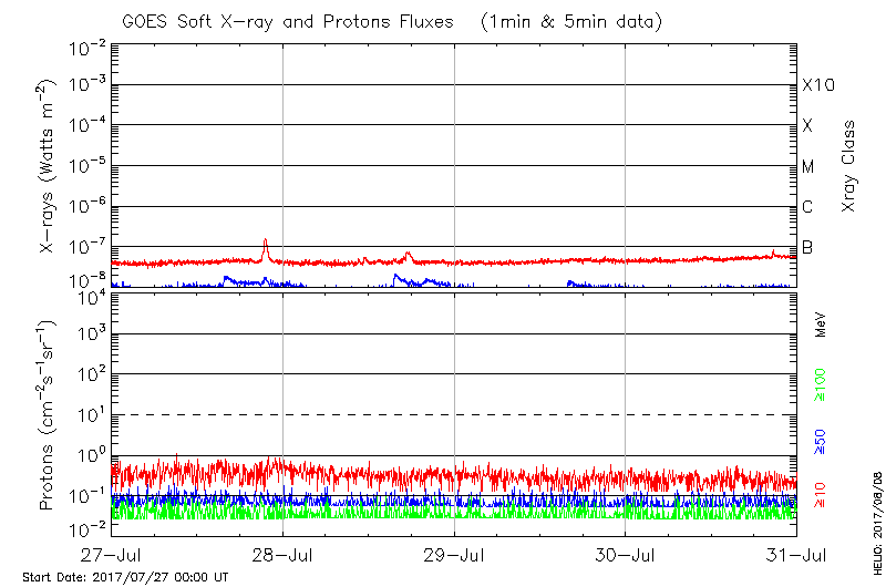 This page provides light-curves generated from GOES soft X-ray and Particle data for the date indicated at the top and the preceding three days.
