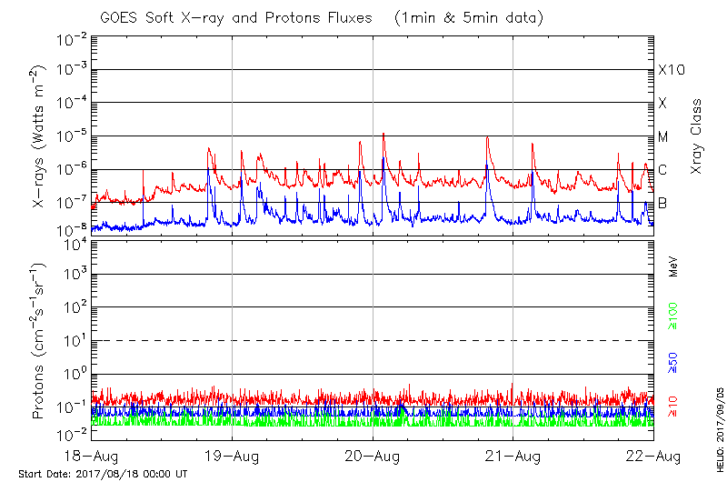This page provides light-curves generated from GOES soft X-ray and Particle data for the date indicated at the top and the preceding three days.