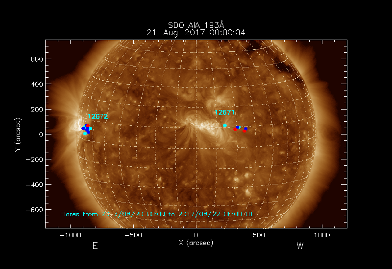 The most recent flares (≤12 hours) are shown as red dots, 12-24 hours ago as blue dots and older ones as turquoise dots.