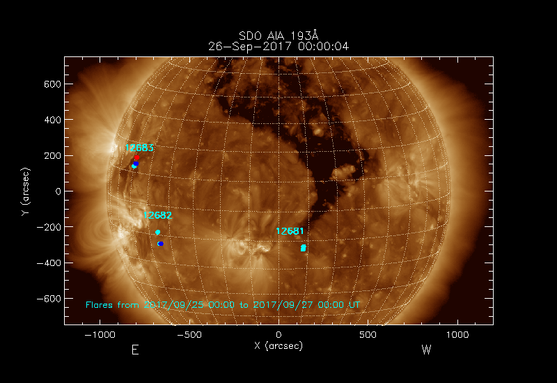 The locations of the flares over-plotted on the image are derived from the flare catalogue
