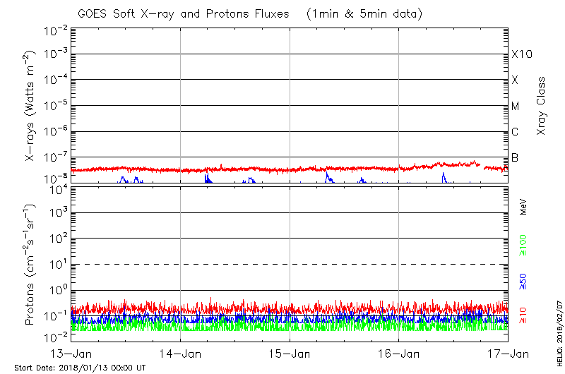 This page provides light-curves generated from GOES soft X-ray and Particle data for the date indicated at the top and the preceding three days.