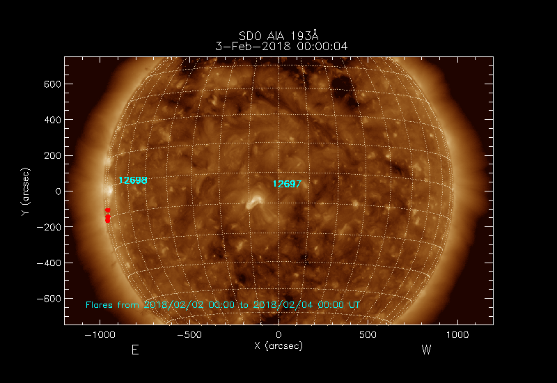 Click on an Active Region plot to display the Region Report including the region evolution and flaring history. HEC Search for NOAA Active Regions (SRS) records for this date and the day before.
