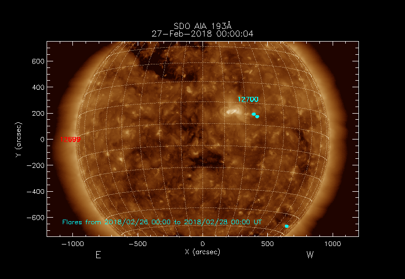 Click on an Active Region plot to display the Region Report including the region evolution and flaring history. HEC Search for NOAA Active Regions (SRS) records for this date and the day before.
