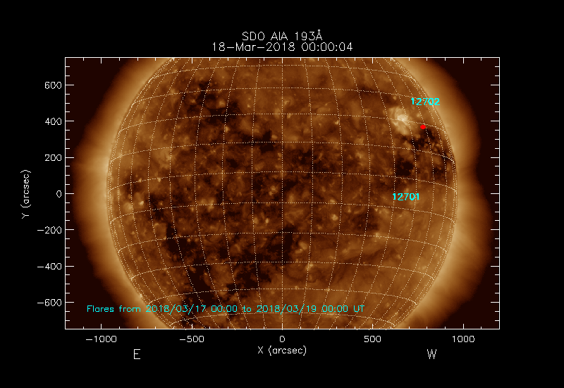 The most recent flares (≤12 hours) are shown as red dots, 12-24 hours ago as blue dots and older ones as turquoise dots.