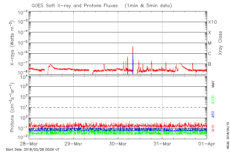 This page provides light-curves generated from GOES soft X-ray and Particle data for the date indicated at the top and the preceding three days.