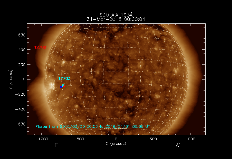 The most recent flares (≤12 hours) are shown as red dots, 12-24 hours ago as blue dots and older ones as turquoise dots.