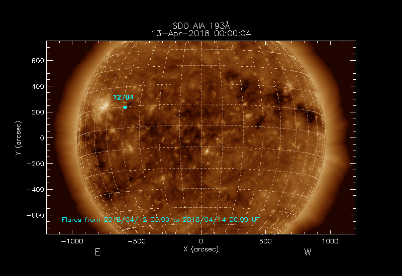 Click on an Active Region plot to display the Region Report including the region evolution and flaring history. HEC Search for NOAA Active Regions (SRS) records for this date and the day before.