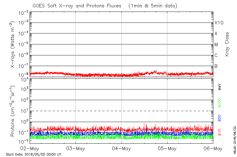 This page provides light-curves generated from GOES soft X-ray and Particle data for the date indicated at the top and the preceding three days.